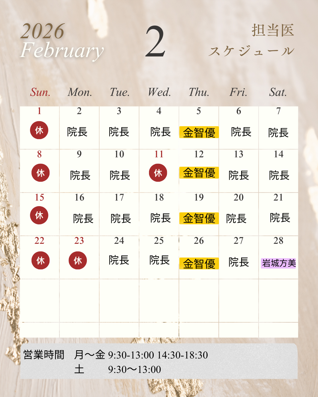 2月と3月の木曜日:形成外科専門医の金智優先生(女性)