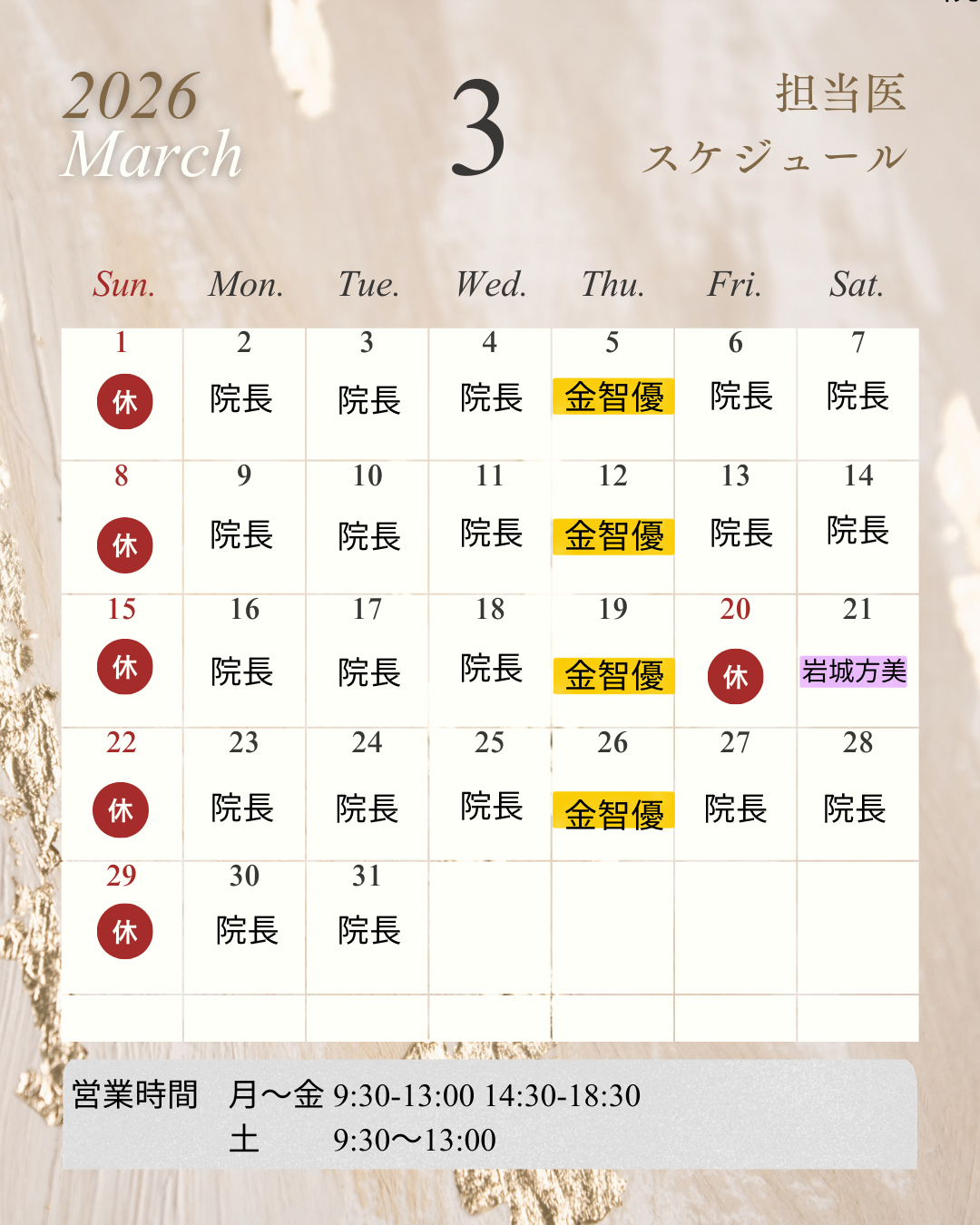 以下の日程は、院長不在のため代診医師による診察となります。